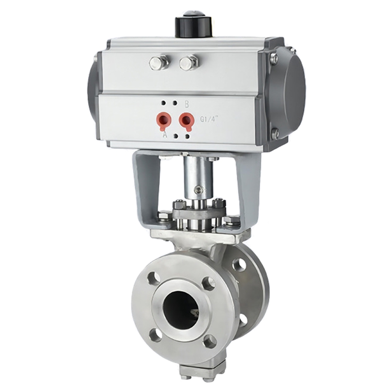气动V型调节球阀,其流道通畅,流量系数大,可调范围大,密封性能好。其带V型切口的阀芯,对阀座具有良好的剪切作用,使该产品适用于石油化工、造纸、污水处理及冶金等行业,对含有纤维和颗粒的悬浊液介质进行流量控制,特别适用于制浆、造纸生产过程中的纸浆、白水、黑液、白液等悬浮颗粒流体及浓浊状流体介质的自动调节。